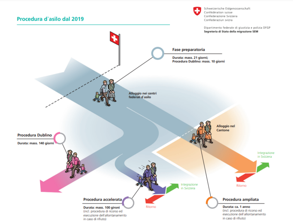 Chi entra in Svizzera illegalmente (quindi senza un regolare permesso) è sottoposto a due possibili procedure: l’espulsione o la possibilità di depositare una domanda d’asilo. Nel secondo caso è la Confederazione, tramite la Segreteria di stato alla migrazione, a occuparsi delle procedure, così come del vitto e dell’alloggio del richiedente che risiede in un Centro federale d’asilo (CFA).