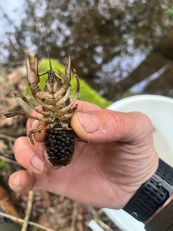 Durante tutto questo periodo, le femmine accudiscono le uova portandole attaccate alle loro appendici addominali (pleopodi). In primavera i gamberi tornano ad essere attivi e, dopo 4-7 mesi di incubazione, tra maggio e giugno avviene la schiusa delle uova: solamente il 10-20% delle uova fecondate darà vita a delle larve, morfologicamente identiche agli adulti ma dalle dimensioni di pochi millimetri. Durante i primi giorni di vita rimangono attaccate con le chele uncinate all’addome materno e dopo circa una settimana iniziano a spostarsi e a nutrirsi autonomamente, ma in caso di pericolo la madre li richiama a sé con feromoni di allarme. Il primo anno è il più rischioso per la sopravvivenza, ma dopo circa 3 anni gli esemplari più forti diventeranno adulti. La muta permette agli animali di accrescersi: il vecchio carapace (esuvia) viene abbandonato per lasciare spazio ad una corazza più grande.